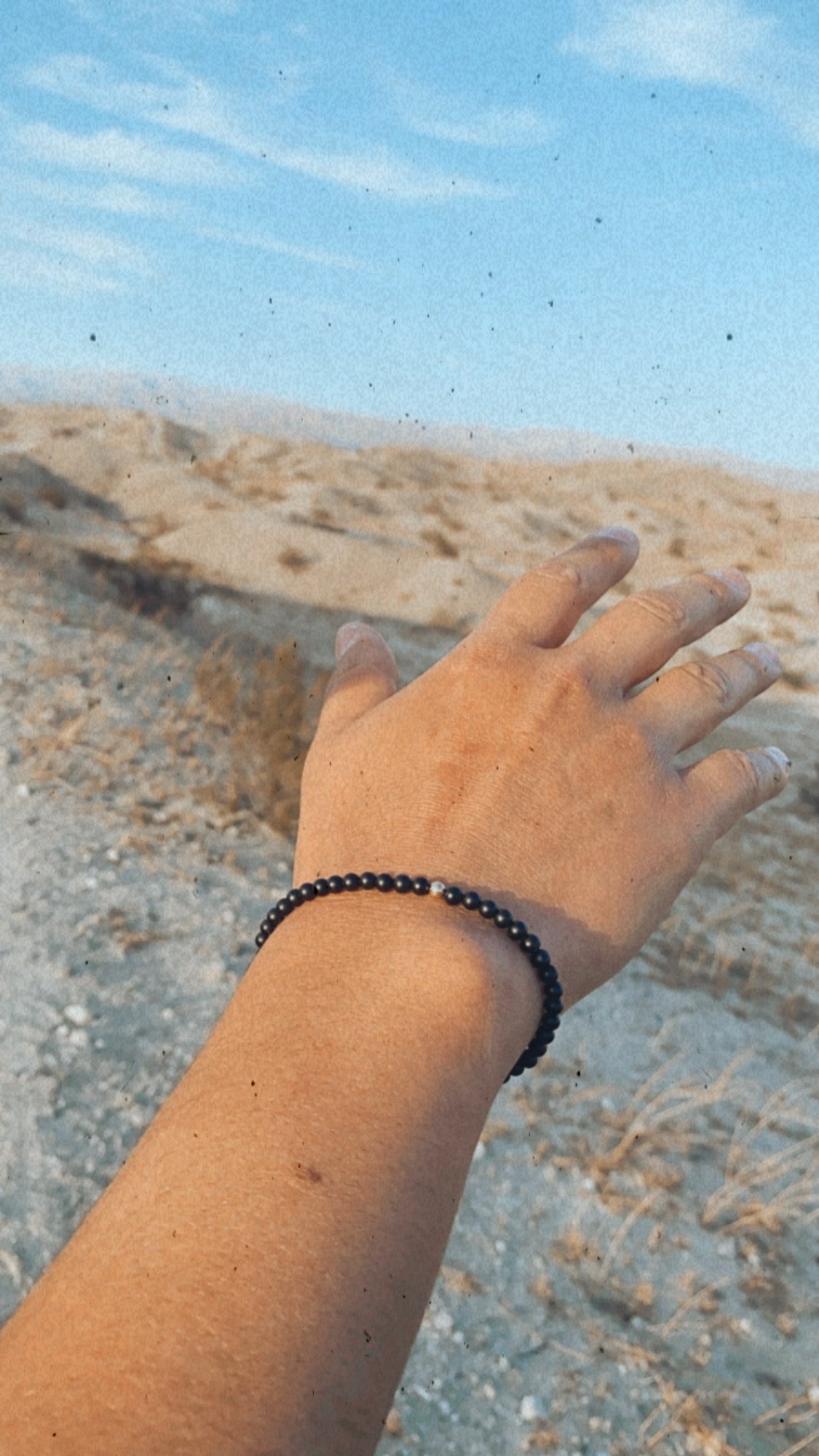 a gold bead with Onyx Stone beads on elastic cord for the guy in your life